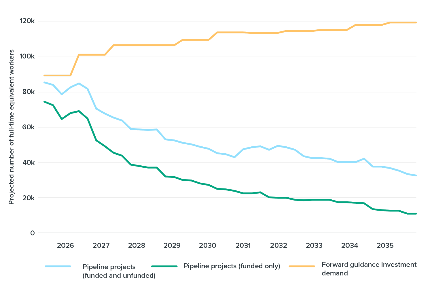 Our forward guidance paints a different picture of workforce demand than project intentions. The National Infrastructure Pipeline, covered in Section 6, compiles information on most infrastructure providers’ current projects and their future project intentions. We model the workforce that would be required to deliver on these intentions. Because infrastructure providers do not plan projects in detail a long way in advance, project-specific workforce demands tail off after a few years.