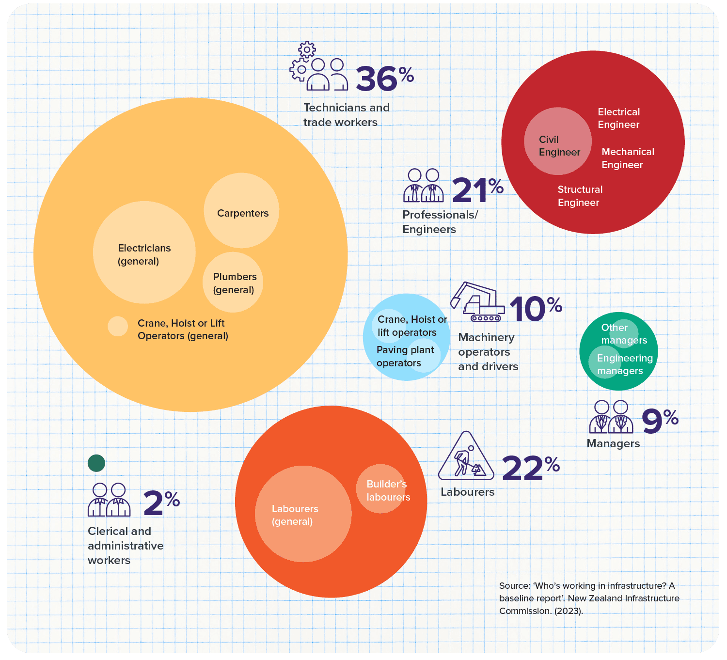 Source: ‘Who’s working in infrastructure? A baseline report’. New Zealand Infrastructure Commission. (2023).