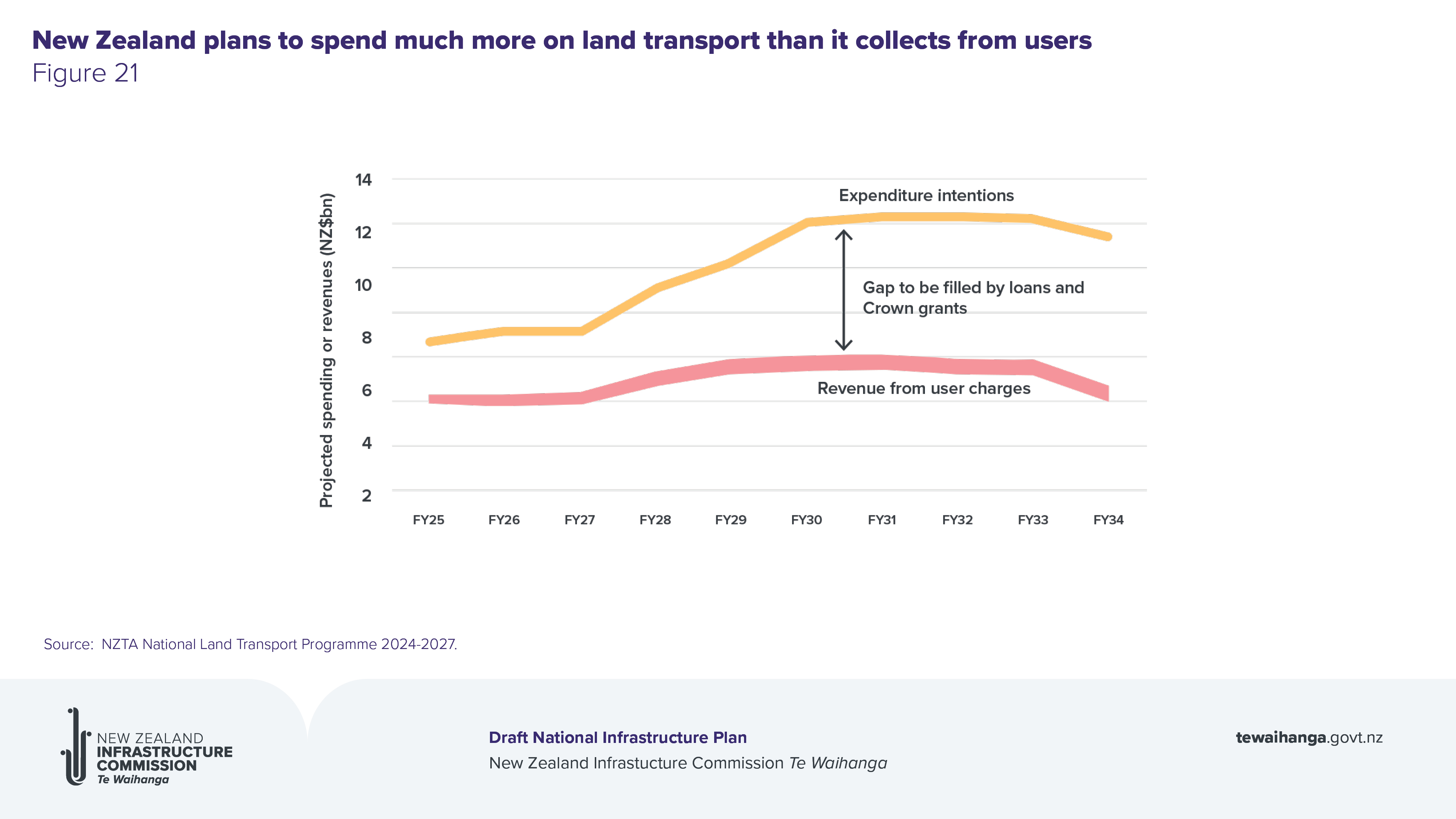 Figure 21: New Zealand plans to spend much more on land transport than it collects from users