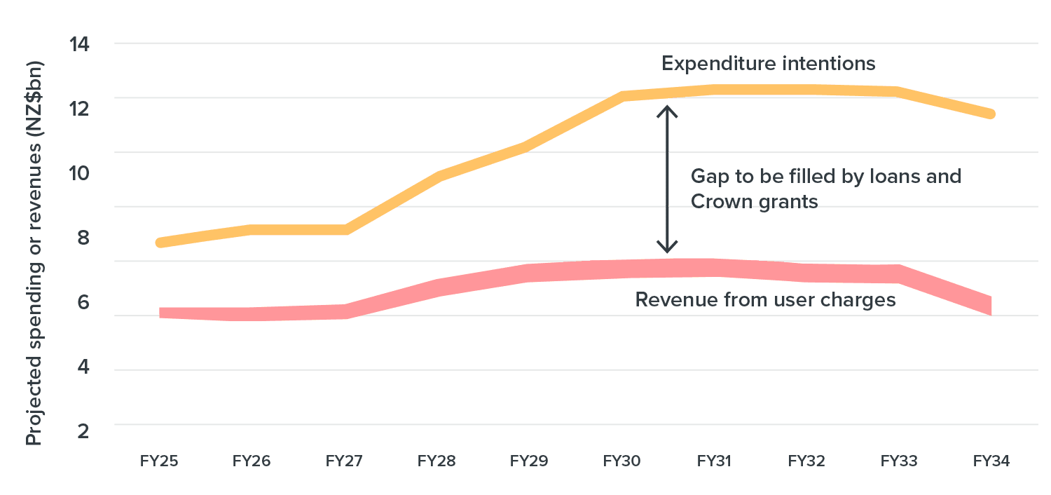 The 2024–2027 National Land Transport Programme includes $32.9 billion in expenditure over a three-year period. Of this, $14.3 billion is available from transport user revenues and local government is expected to contribute $5.8 billion, leaving a gap of over $12 billion in a three-year period. This must be topped up by Crown grants and loans, in turn limiting the money that is available for other types of central government infrastructure. In early 2024, the Treasury identified a potential $27 billion to $38 billion gap between expenditure and revenue over the next 10 years.