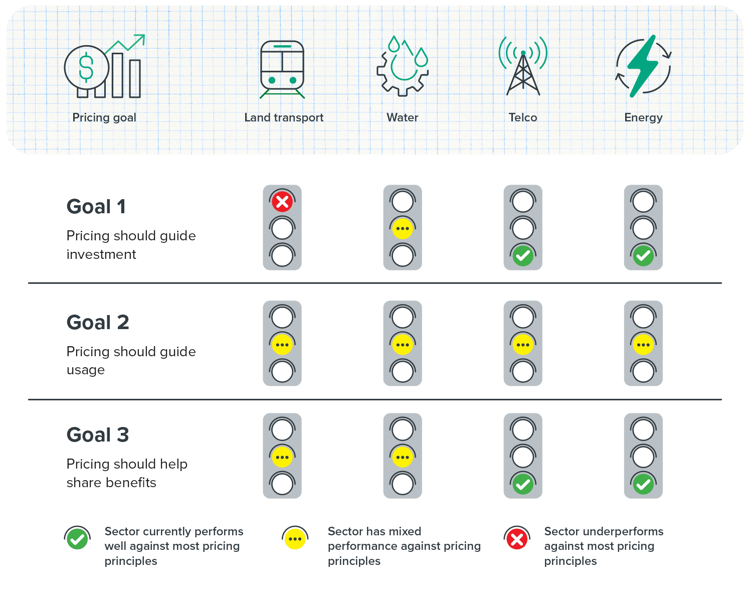 A 2024 study of infrastructure pricing found that practices for electricity and telecommunications networks are generally well aligned with network pricing goals (Figure 24). These sectors predominantly collect their revenue through direct user charges and operate within market structures and policy settings that support good pricing. By contrast, land transport and water pricing does not perform as well against these goals.