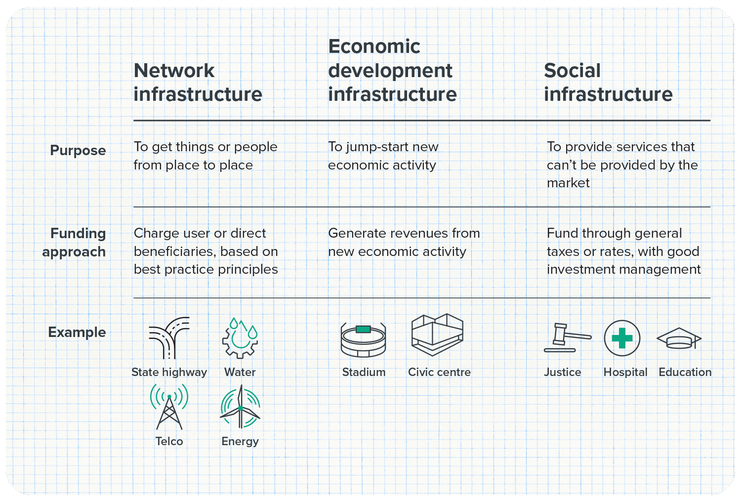 We differentiate infrastructure services that can pay for themselves and those that cannot. Network infrastructure, like transport, water, electricity, and telecommunications, is different from social infrastructure, like schools, hospitals, courts, prisons, public parks and open spaces, and the defence estate.