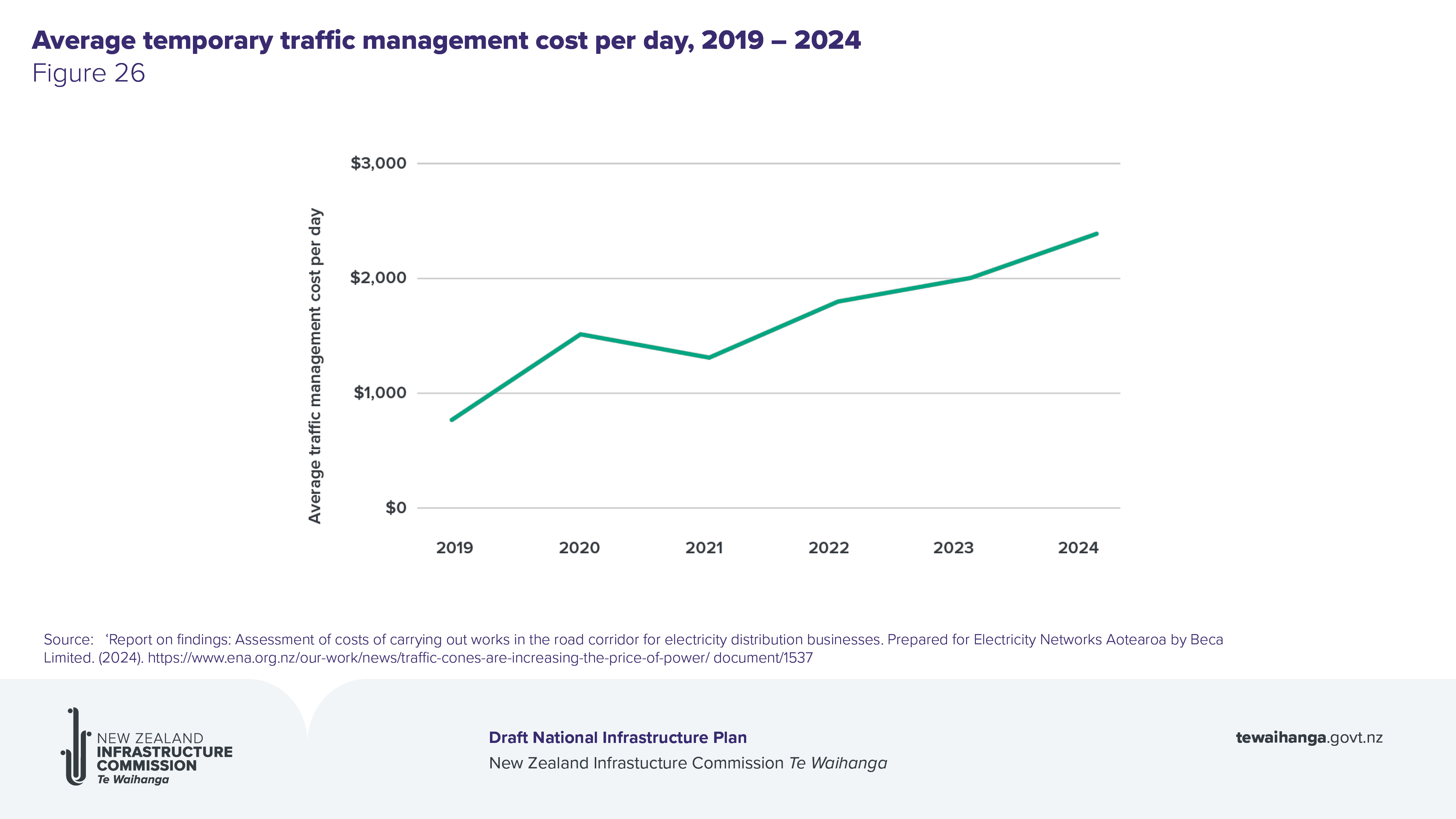 These changes have safety benefits but also increase costs for routine infrastructure maintenance and construction. Electricity Networks Aotearoa estimates that the per-day cost of temporary traffic management for electricity lines work tripled between 2019 and 2024 (Figure 26). These costs fall most heavily on small electricity line maintenance projects, and, in some cases exceed 20% of project budgets. Their research did not analyse changes in safety outcomes, however.