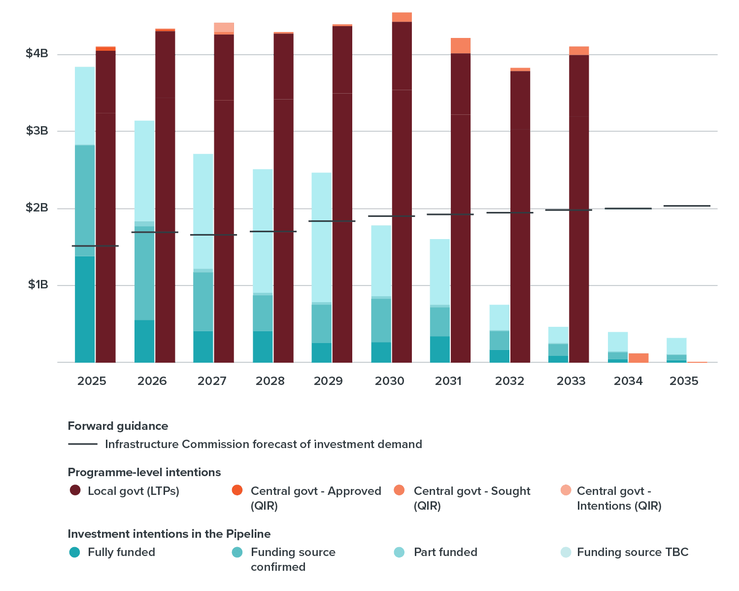 - The following chart shows that projected spending to deliver initiatives in planning and delivery in the Pipeline (blue bars) and programme-level intentions in local government Long Term Plans and central government’s reporting to the Treasury’s Investment Management System (red and orange bars) are significantly higher than the Commission’s investment demand outlook (black lines) over the 2025–2035 period.