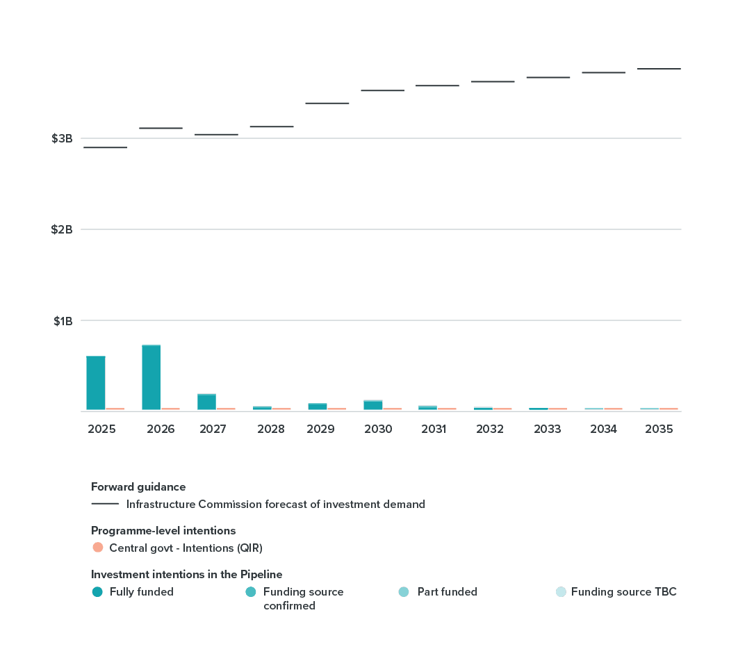 - The following chart shows that projected spending to deliver initiatives in planning and delivery in the Pipeline (blue bars) are significantly below than the Commission’s investment demand outlook (black lines) over the 2025–2035 period. This is due to limited contributions by the commercial entities responsible for telecommunications investment.