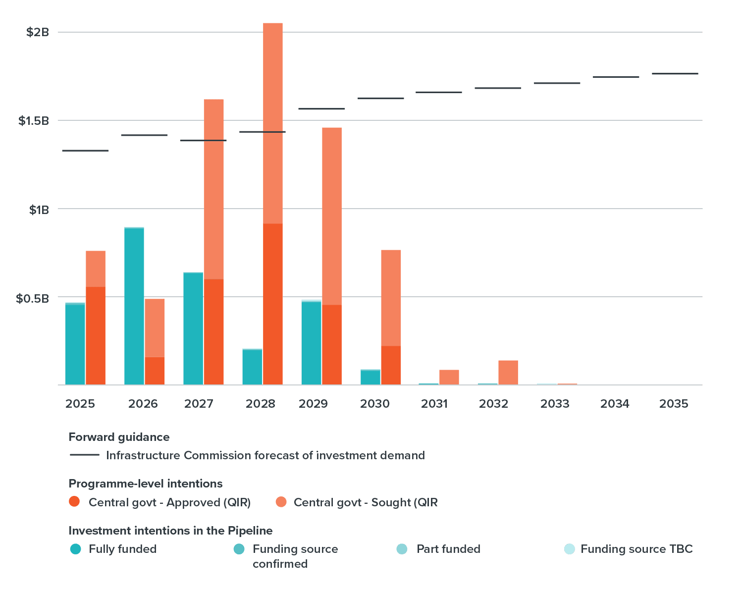 - The following chart shows that projected spending to deliver initiatives in planning and delivery in the Pipeline (blue bars) and programme-level intentions in central government’s reporting to the Treasury’s Investment Management System (orange bars) are lower than the Commission’s investment demand outlook (black lines) over the 2025–2035 period.