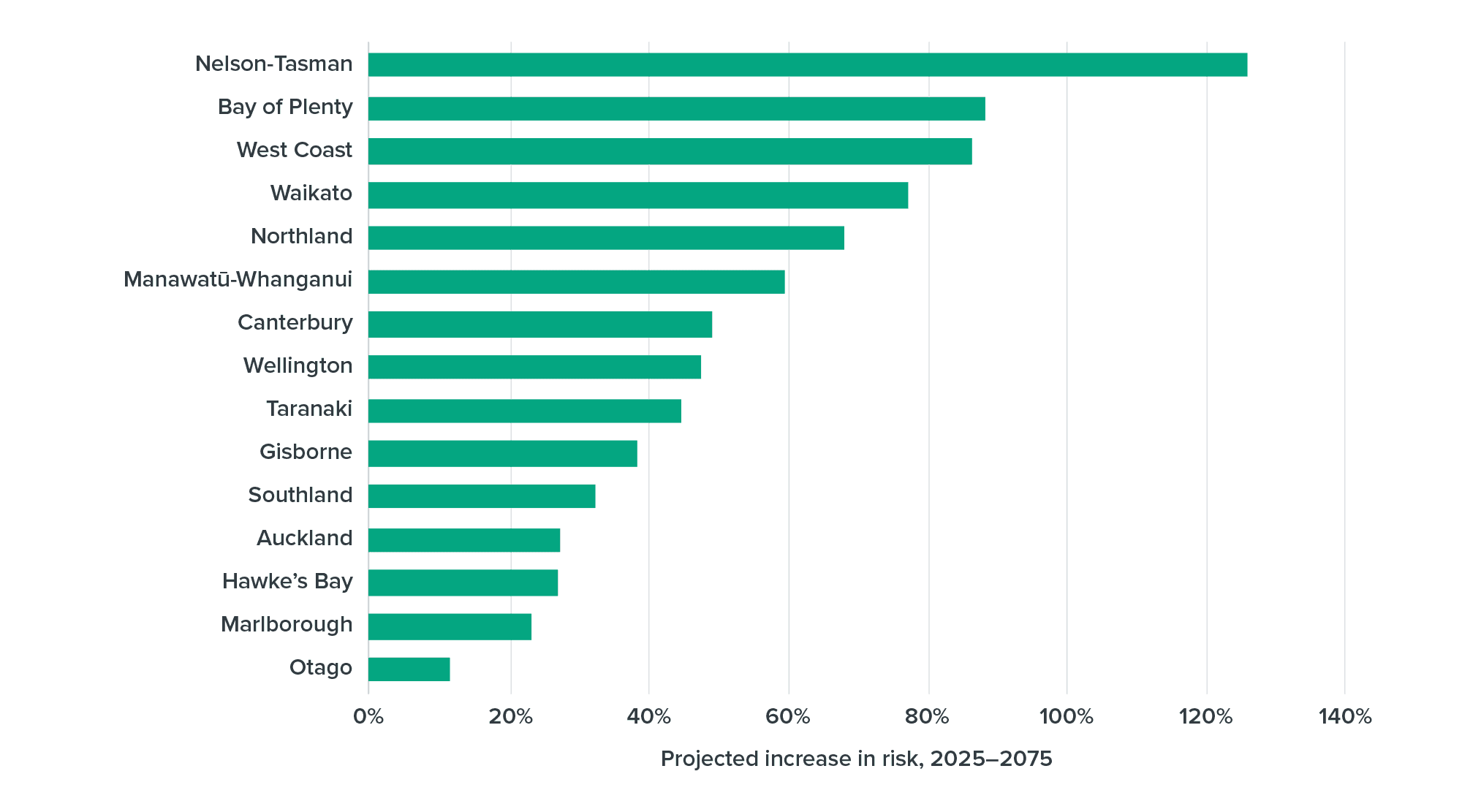 The Commission worked with Earth Sciences New Zealand to understand the exposure and severity of flood risk events likely to happen in New Zealand over the next 50 years. Risk – based on the change in average annual expected damage to private properties – is projected to increase most sharply for regions like Nelson-Tasman, Bay of Plenty and the West Coast. Coastal flooding from sea level rise is expected to be a larger driver of increased risk than more intense rainfall flooding events.