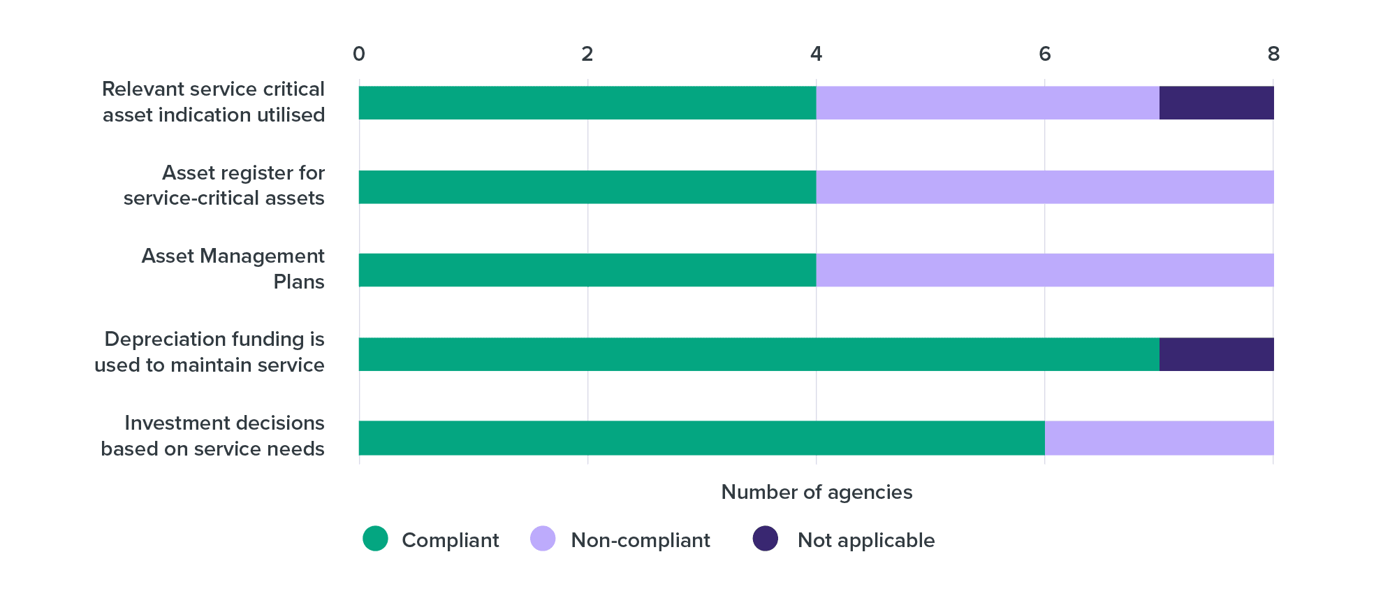 Capital-intensive agencies should consistently meet basic asset management requirements. A small number of entities manage a large share of public assets, so improving their performance would significantly lift system-wide outcomes. As of June 2025, four of eight capital-intensive agencies reported that their asset registers did not meet required standards, and four lacked asset management plans to guide strategic, tactical, and operational decisions (Figure 28). Because this information is self-reported, actual performance may be weaker. Several agencies also noted that compliance varied across asset classes, meaning headline results may mask gaps within portfolios.