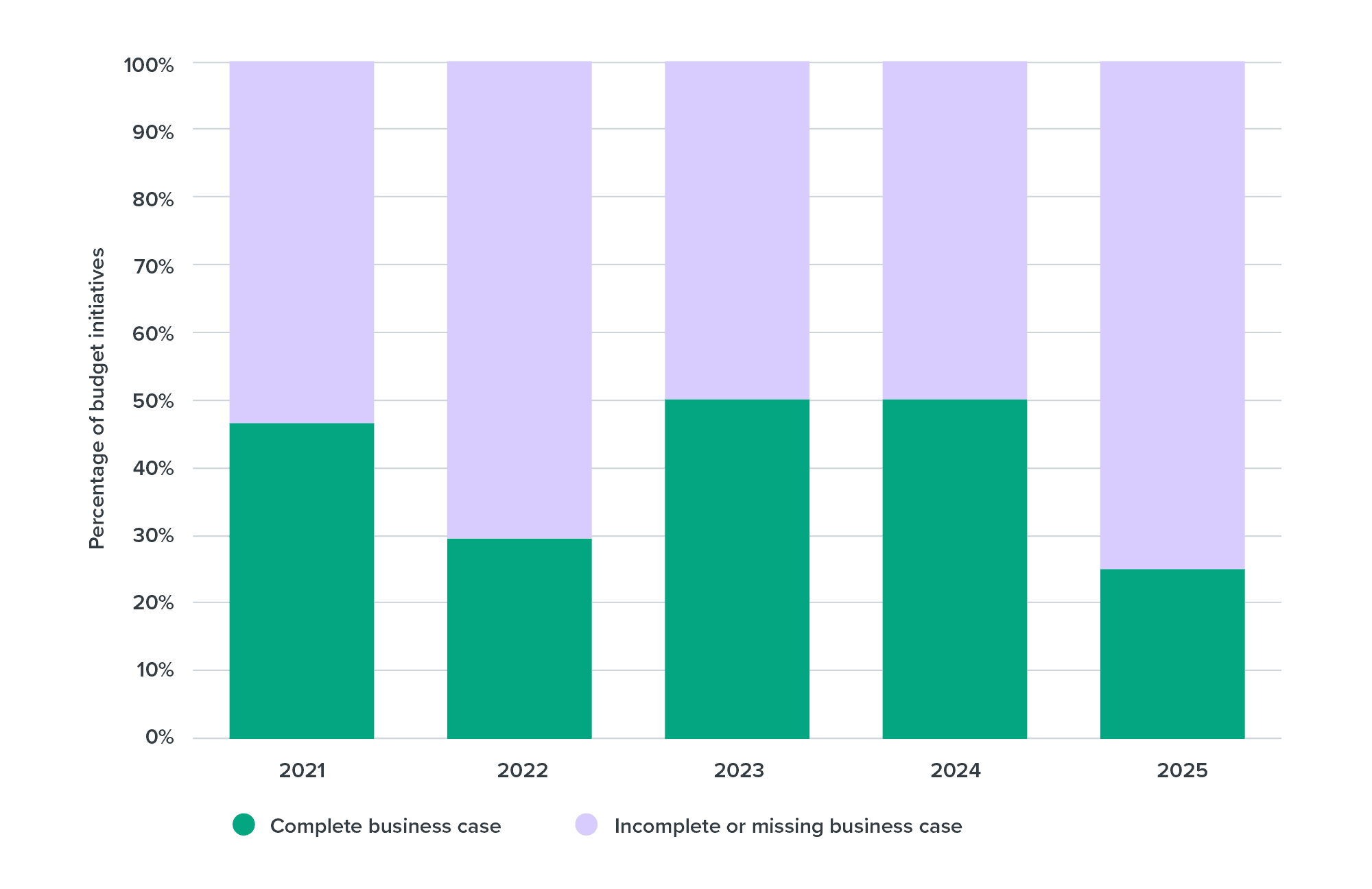 Figure 33: Compliance with business case requirements among Budget infrastructure project funding bids reviewed by the Treasury’s Investment Panel from 2021 to 2025