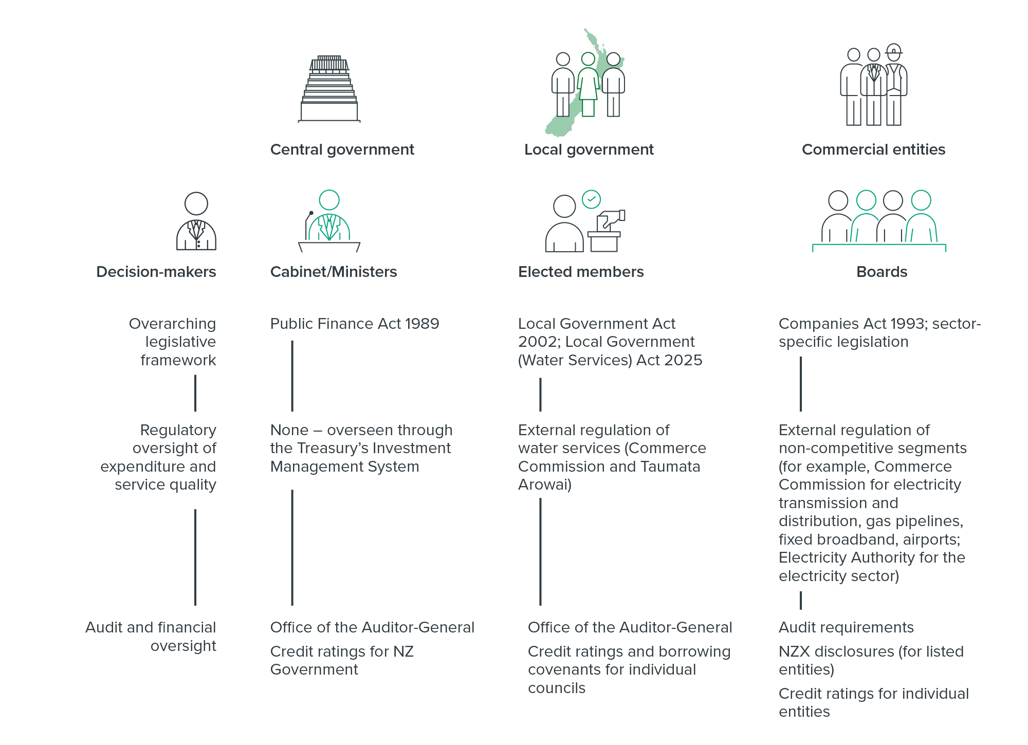 Different governance and oversight arrangements apply across infrastructure sectors because providers face different incentives and responsibilities. Central and local government providers are governed by elected representatives accountable to voters. Their oversight arrangements are tailored to this context (Figure 45). By contrast, commercial entities are governed by boards accountable to shareholders, and many are subject to additional regulatory oversight of their expenditure and service quality.
