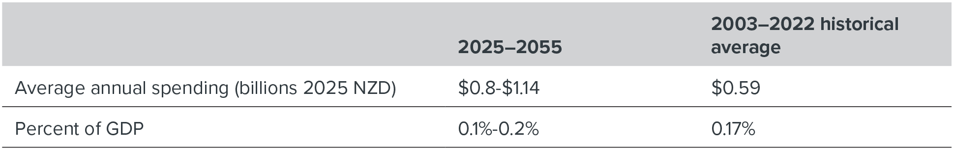 - The current value of NZDF assets (excluding land) was about $10 billion in 2024. About $5.5 billion of this is specialist military equipment and almost $4 billion was buildings and infrastructure. Investment (addition of fixed assets) has averaged about $542 million (in 2025 dollars) since 2003, although this has increased in recent years.