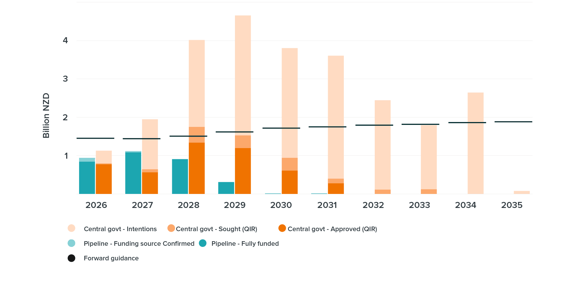 - The following chart shows that projected spending to deliver initiatives in planning and delivery in the Pipeline (turquoise bars) and approved programme-level intentions in central government’s reporting to the Treasury’s Investment Management System (orange bars) are lower than the Commission’s investment demand outlook (black lines) over the 2026–2035 period. However, the full value of investment intentions reported to the Investment Management System are higher than the Commission’s investment demand outlook.