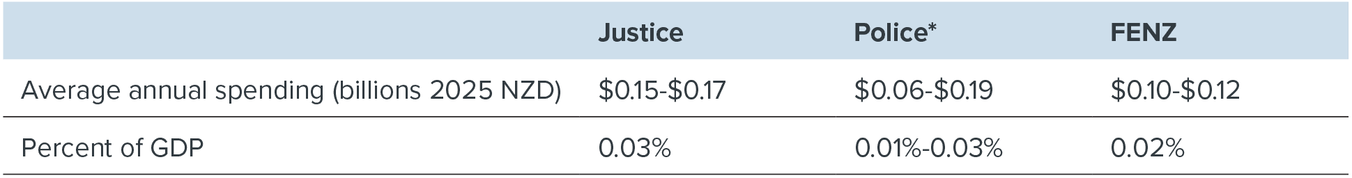 Note: Spending is modelled for law and public safety as a whole, then broken down into each subsector’s estimated relative share of total government public administration and safety, using estimates of capital stock and investment over the past 10 to 20 years. *Police’s range is wider than the other two sectors because it’s relative share varies depending upon on the measure – historical investment share or historical capital stock share.