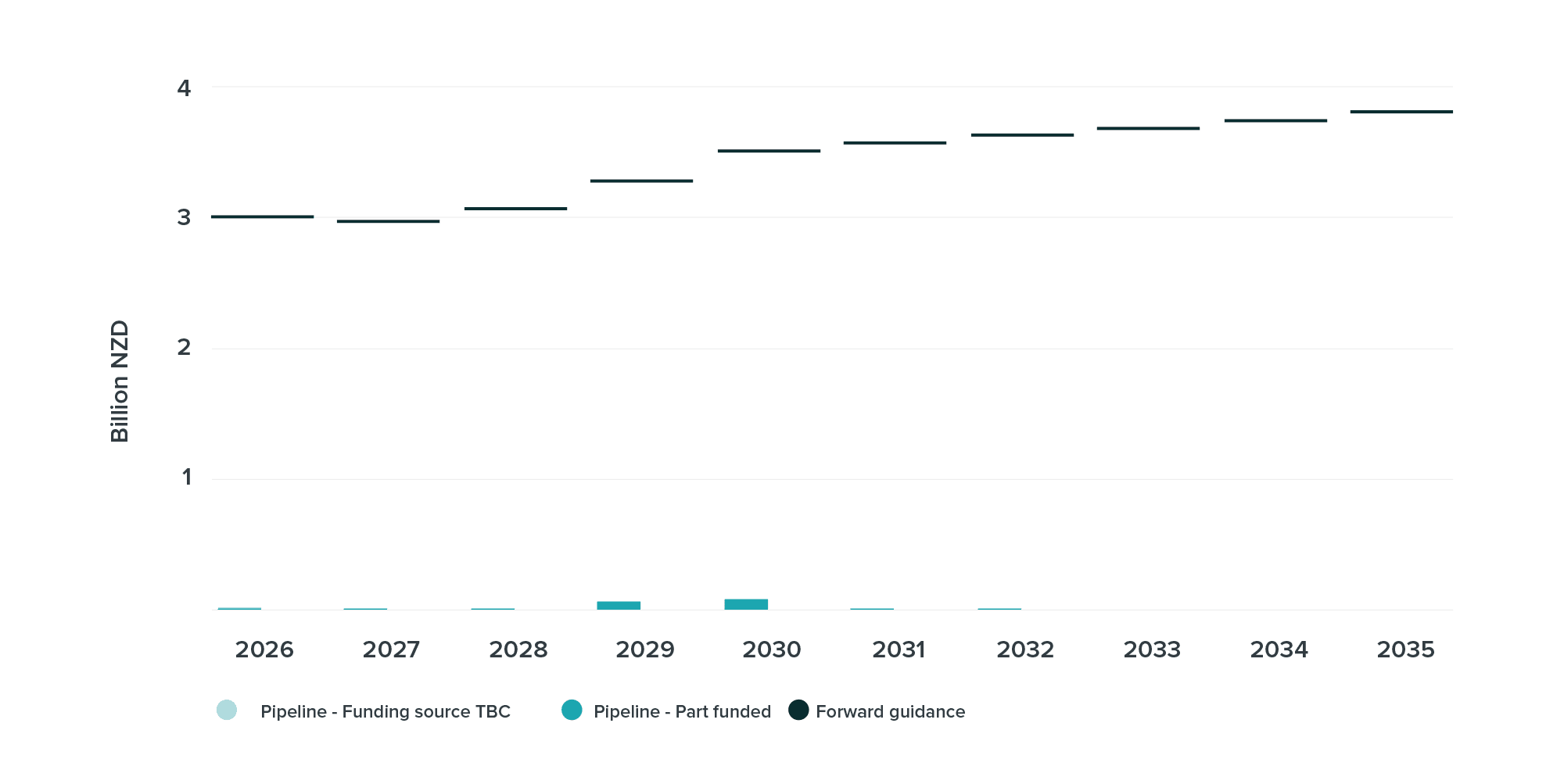 - The following chart shows that projected spending to deliver initiatives in planning and delivery in the Pipeline (turquoise bars) is significantly below the Commission’s investment demand outlook (black lines) over the 2026–2035 period. This is due to limited Pipeline contributions by the commercial entities responsible for telecommunications investment.