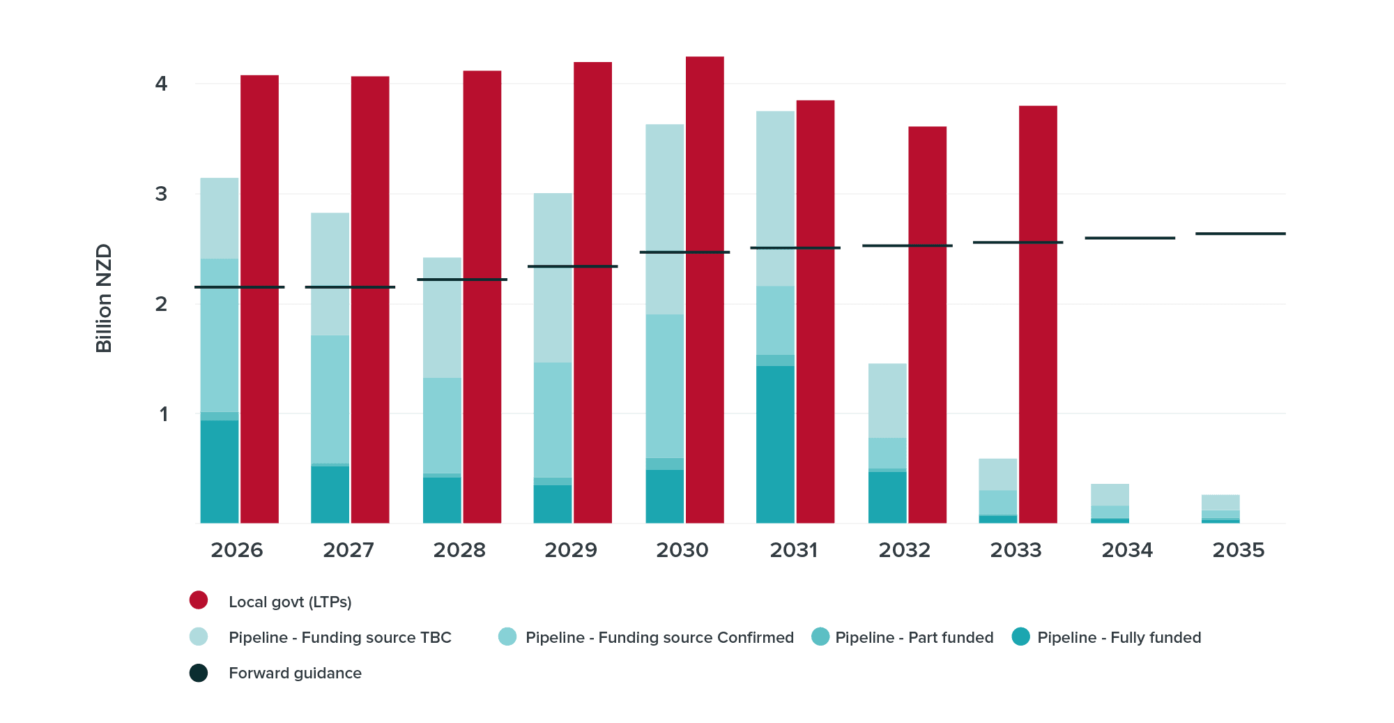 - The following chart depicts projected spending to deliver initiatives in planning and delivery in the Pipeline (turquoise bars), and programme-level intentions in local government long-term plans (red bars). These investment intentions are significantly higher than the Commission’s investment demand outlook (black lines) over the 2026–2035 period.