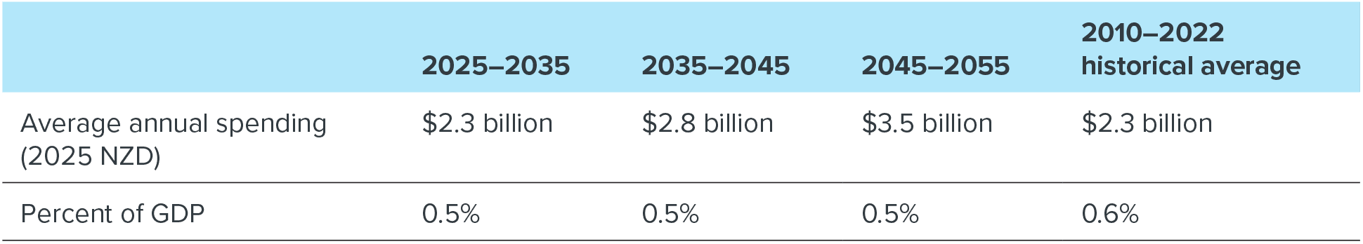 Our Forward Guidance is based upon categories of investment and capital stock data from Stats NZ, where waste and water services are combined. We estimate that waste is a very small percentage of this category, so our Forward Guidance for the sector can be interpreted as mostly water. This table provides further detail on our Forward Guidance, which is summarised in Chapter 3. Further information on this analysis and the underlying modelling assumptions is provided in a supporting technical report.164 This data is for wastewater, stormwater, and drinking water services, but excludes irrigation and flood protection infrastructure that is unrelated to drainage.