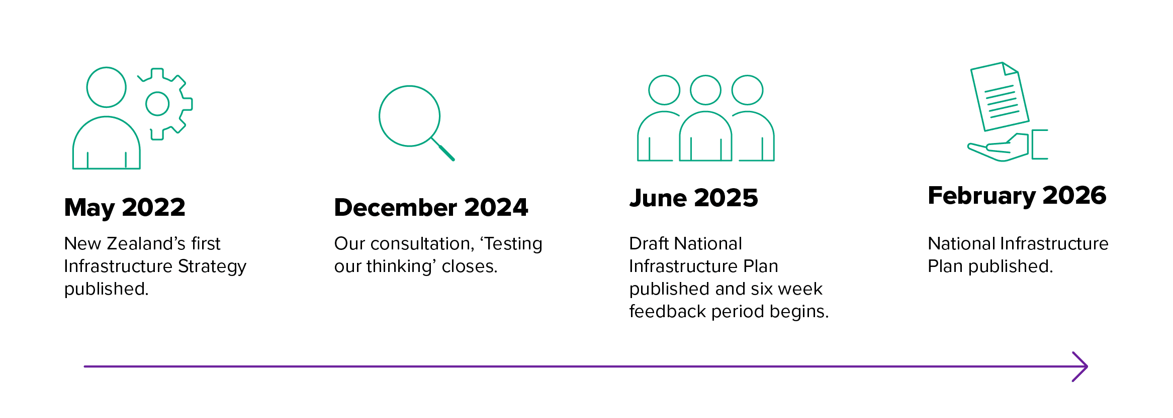 In 2024 we asked for feedback on a discussion document, Testing our thinking, that described what we expected a National Infrastructure Plan will cover and the problem it’s trying to solve, as well as the approach we proposed to take to develop it.