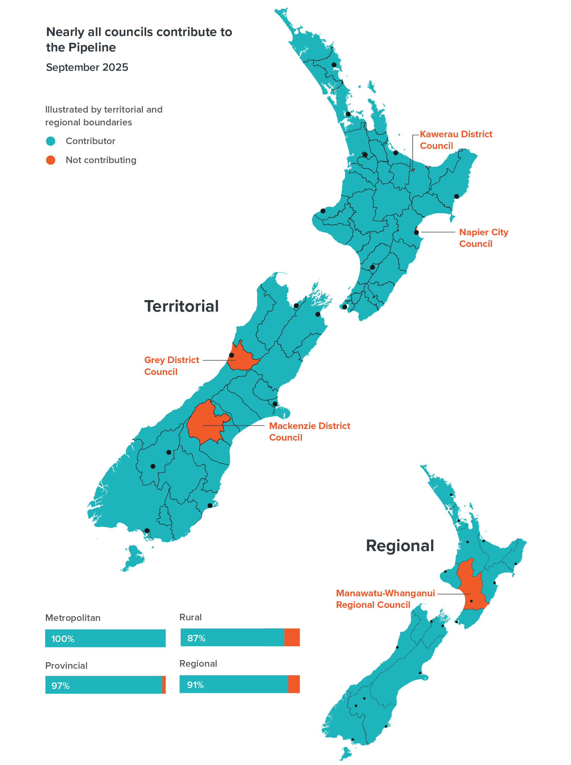 Pipeline contributors include 21 central government organisations, 6 State owned enterprises, 4 electrical lines companies covering 54% of the installation control points (ICPs) 6 and 73 councils (94% of councils across New Zealand), covering 98% of all rate revenue collected. Council contributors are illustrated in Figure 13.