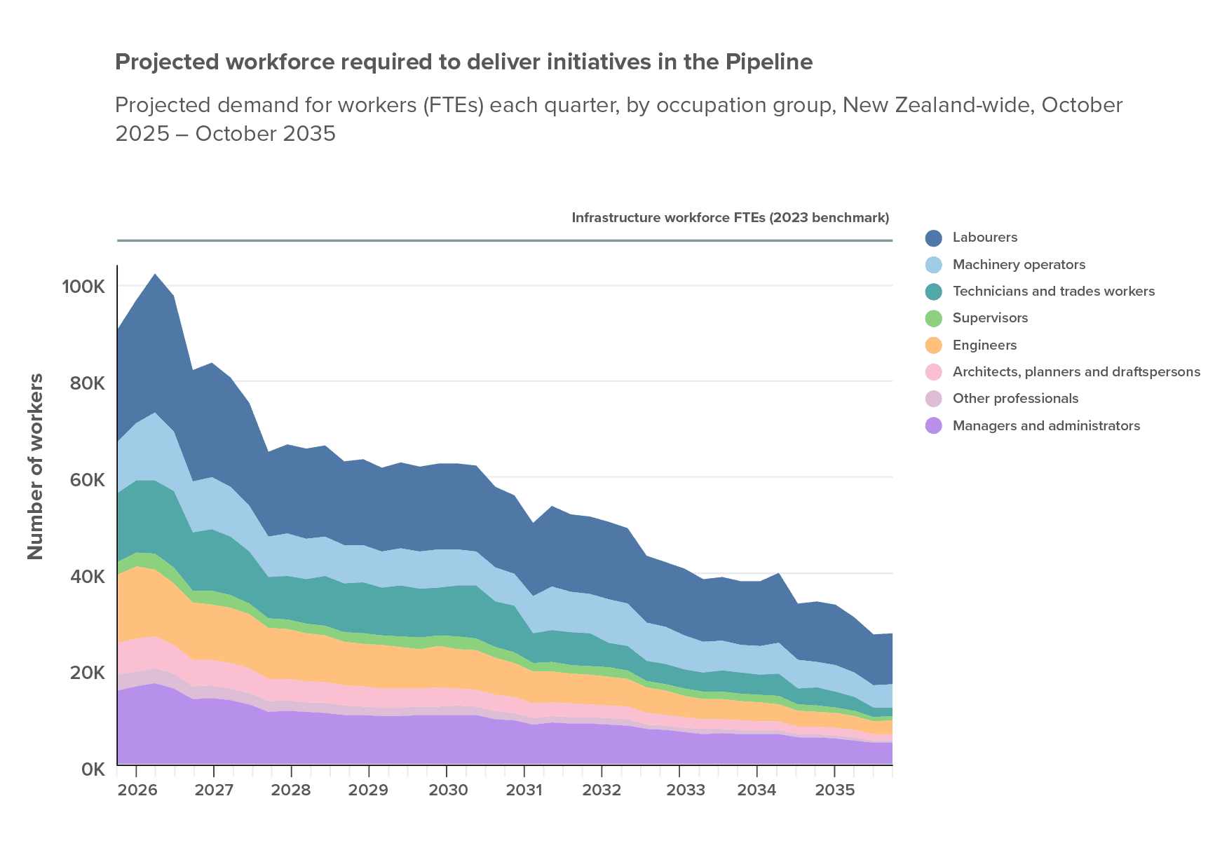 Figures 6 to 8 present different views of the projected infrastructure full time equivalent (FTE) workforce required to deliver Pipeline initiatives4. A 2023 benchmark for the estimated infrastructure workforce size (supply of workforce) is included as a reference. Labour markets are dynamic by nature, and supply will have changed from 2023. However, the 2023 reference line provides a useful indication of where there may be available workforce capacity in the market, or where delivery may become constrained due to excess workforce demand. A gap between the 2023 supply benchmark and forward demand projections does not represent a drop in demand for workers. The Pipeline does not yet cover all infrastructure project activity within New Zealand and as a result, these projections may understate demand.
