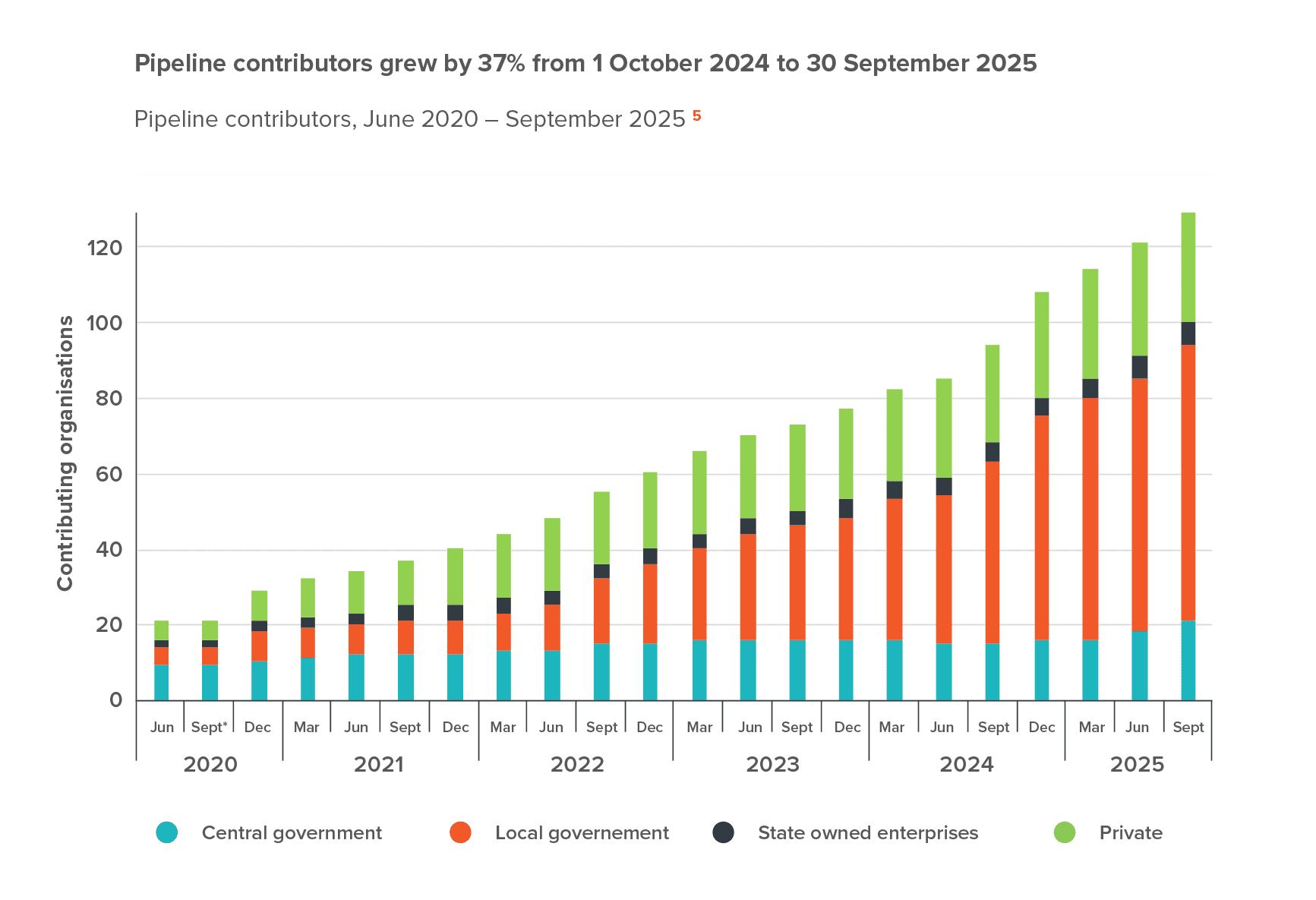 In total, 129 organisations now contribute information, up 37% on 12 months ago. We thank our partners for their efforts and another step change to improving the national coverage of the Pipeline and supporting improved planning and efficiency in the construction sector.5