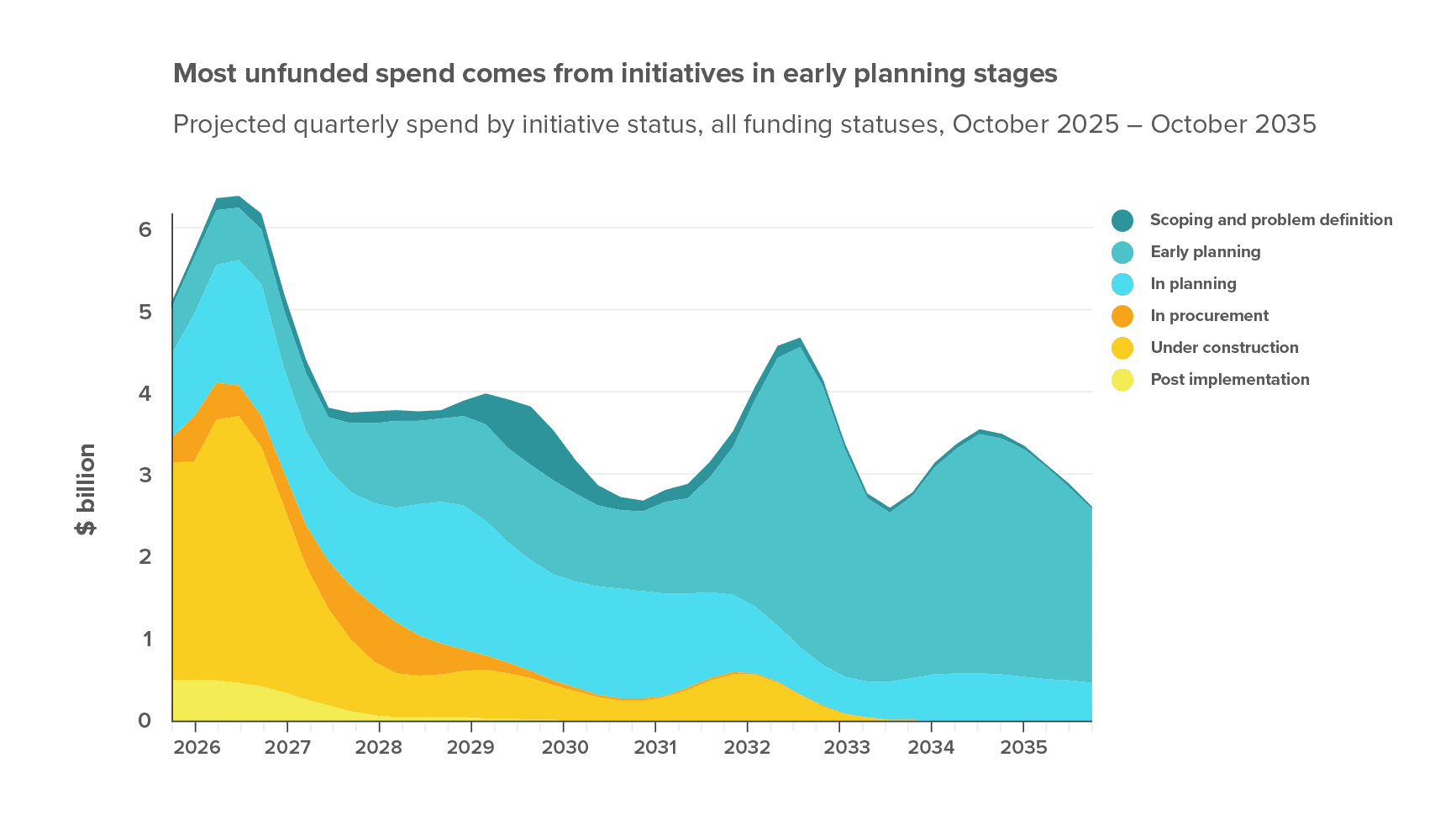 The projected spend across all funding statuses for 2026 is currently $24.1 billion. Near-term projected spend figures generally rise when modelled each quarter, as initiatives with short planning horizons are planned and submitted to the Pipeline.