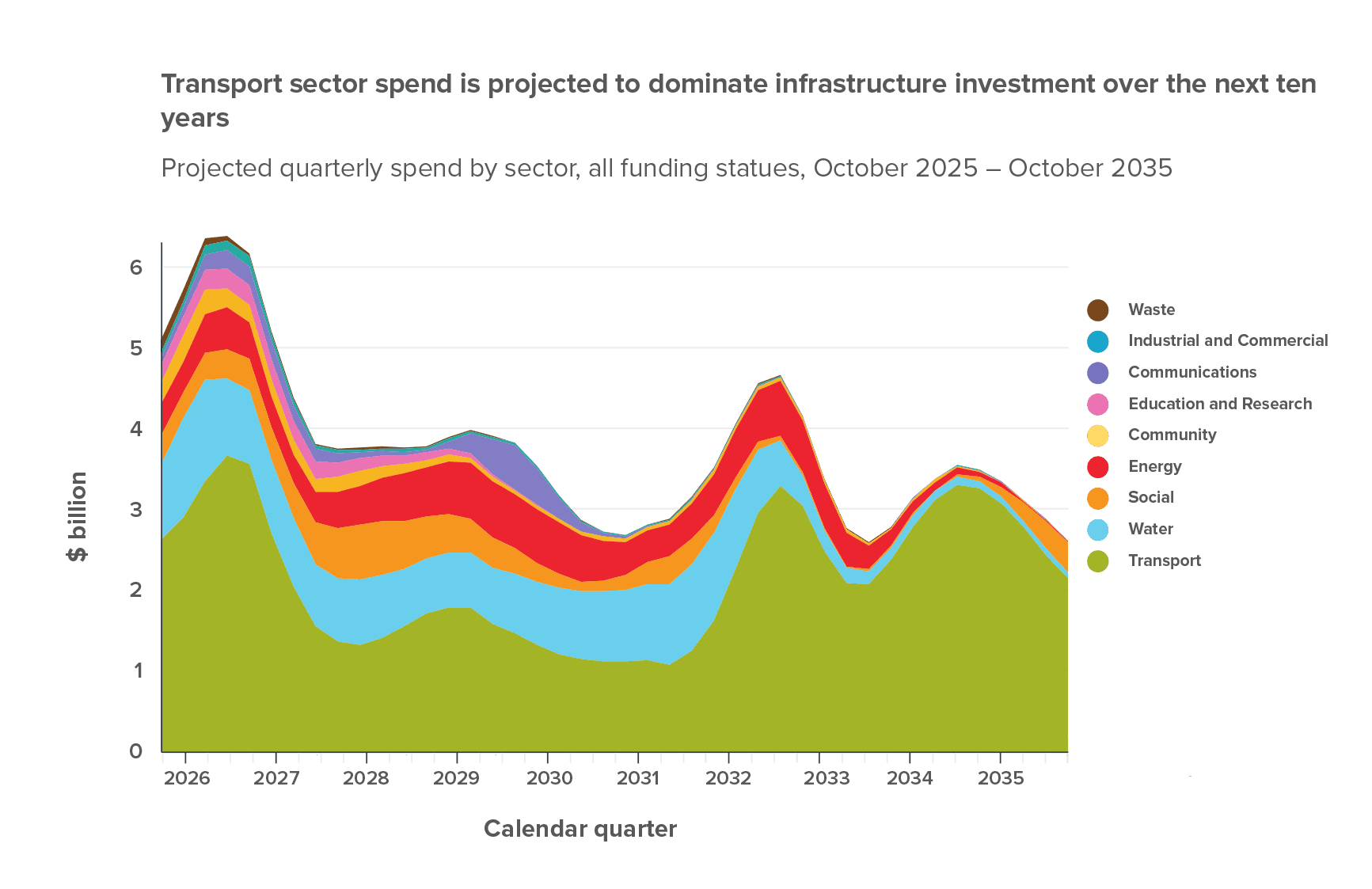 - Figure 5, Projected spend by infrastructure sectors, for all funding status shows the transport sector (including road, rail, ports, and airports) continues to dominate the Pipeline over the next 10 years. In 2025 transport spend accounts for $10.3 billion or 50% of total projected spend. Annual spend for all initiatives in this sector remains above $4.5 billion across the 10-year projection. From 2025–2035 the total projected transport spend is $85 billion or 54% of spend across all sectors. The water sector accounts for $3.9 billion or 19% of projected spend in 2025. Projected annual spend in the water sector fluctuates between $2.6 billion and $4.1 billion between 2025 and 2032 and, based on current submitted information, drops to $0.7 billion in 2033.