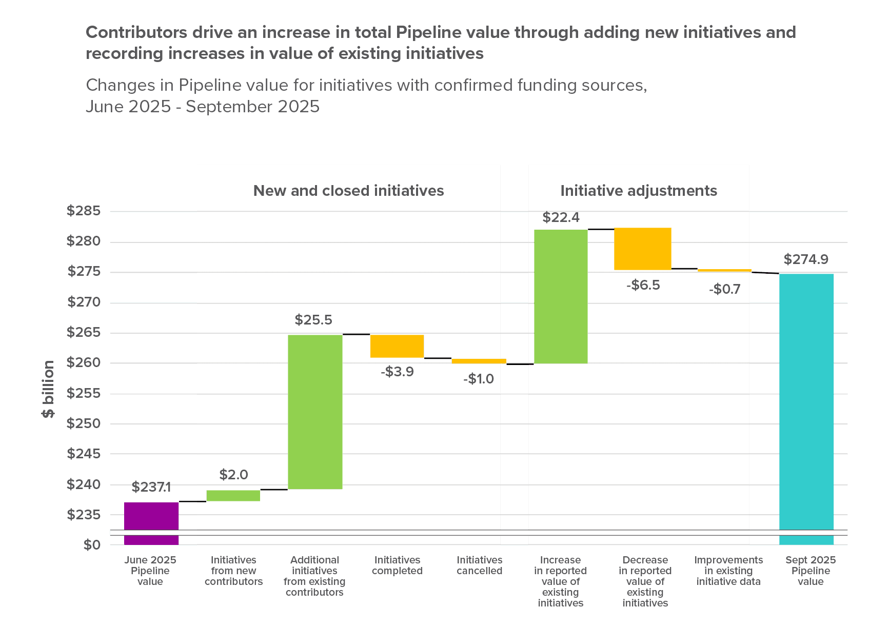 - $10.9 billion additional value from initiatives that progressed in funding commitment between quarters or were reported to the Pipeline with an updated funding status of ‘fully funded’ in September:
