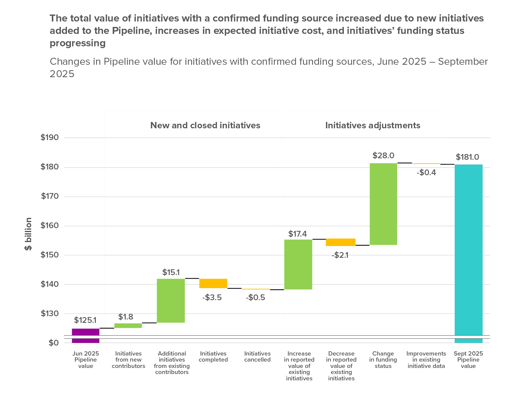 The combined value of initiatives reported as fully funded, part funded or with a confirmed funding source was $181 billion, up $56 billion from June 2025. The drivers of this increase are discussed later the report and shown in Figure 9.