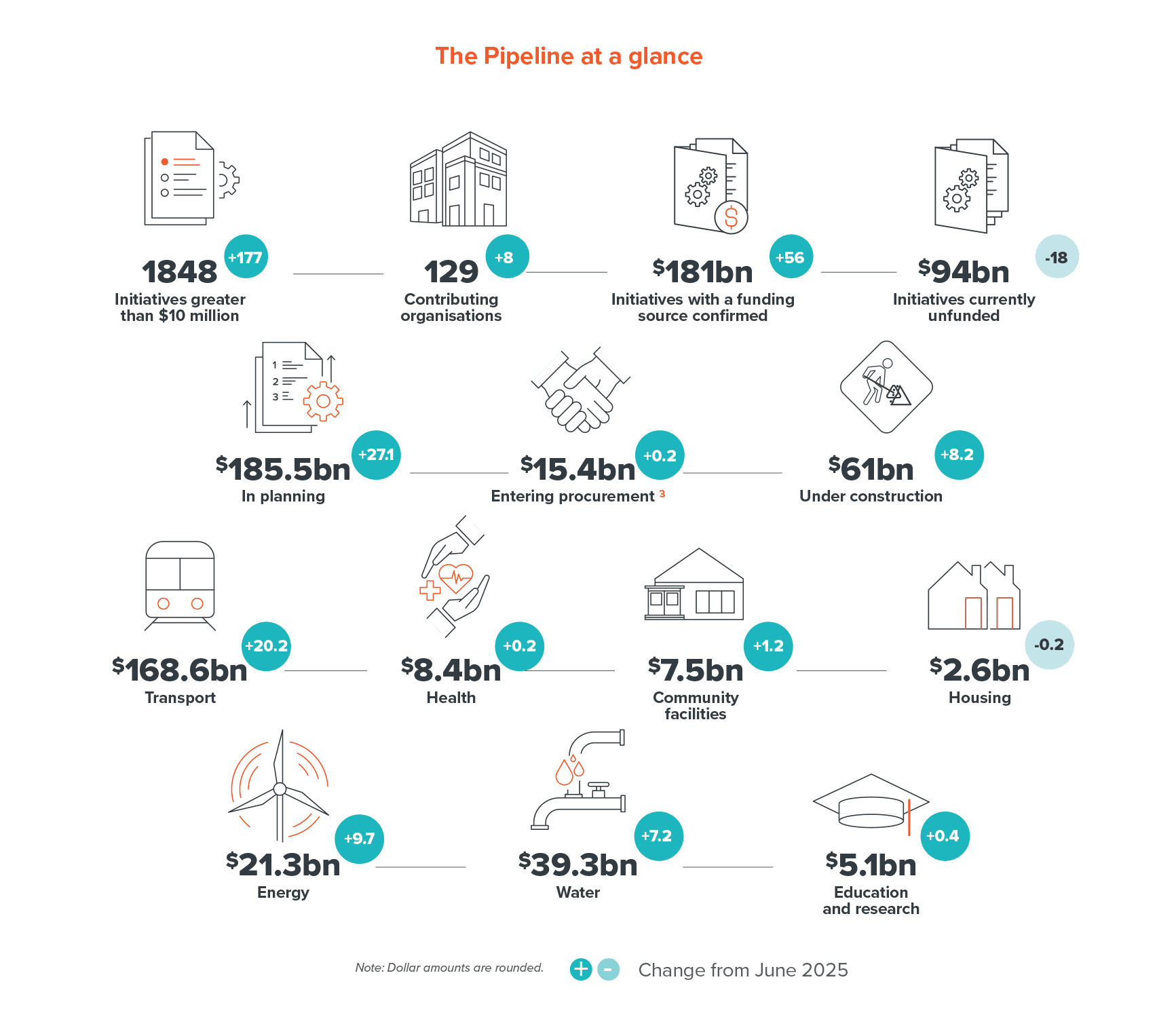 In September 2025 the Pipeline included information on almost 12,000 infrastructure initiatives underway and in planning for 139 infrastructure providers. These initiatives span projects and programmes at various stages of planning, funding commitment, and delivery.