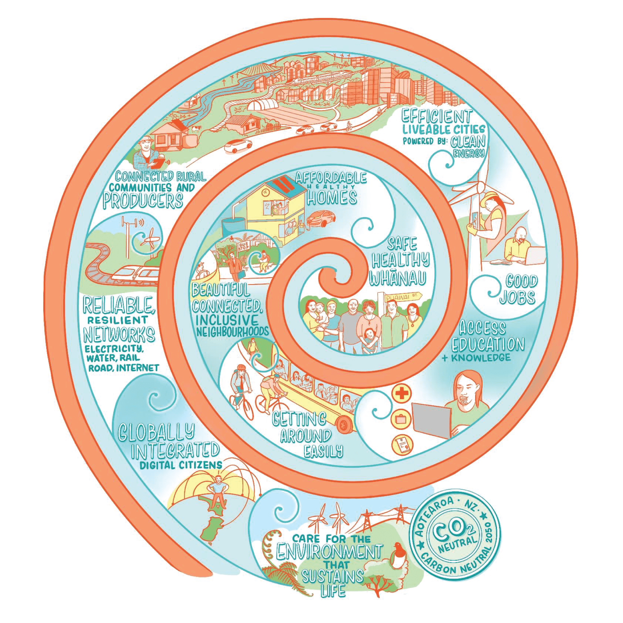 This strategy sets a path to a 2050 where infrastructure continues to support wellbeing. We have a strong economy, options for how we get around, clean energy and access to health and education as our population grows and moves, and as technology changes. We’re resilient to shocks and stresses, including those that climate change brings. Infrastructure plays its part in supporting these and other goals, offering a foundation for a thriving New Zealand. The koru below (Figure 4) contains the many ways in which we expect infrastructure to support New Zealand’s people, places and businesses through to 2050.