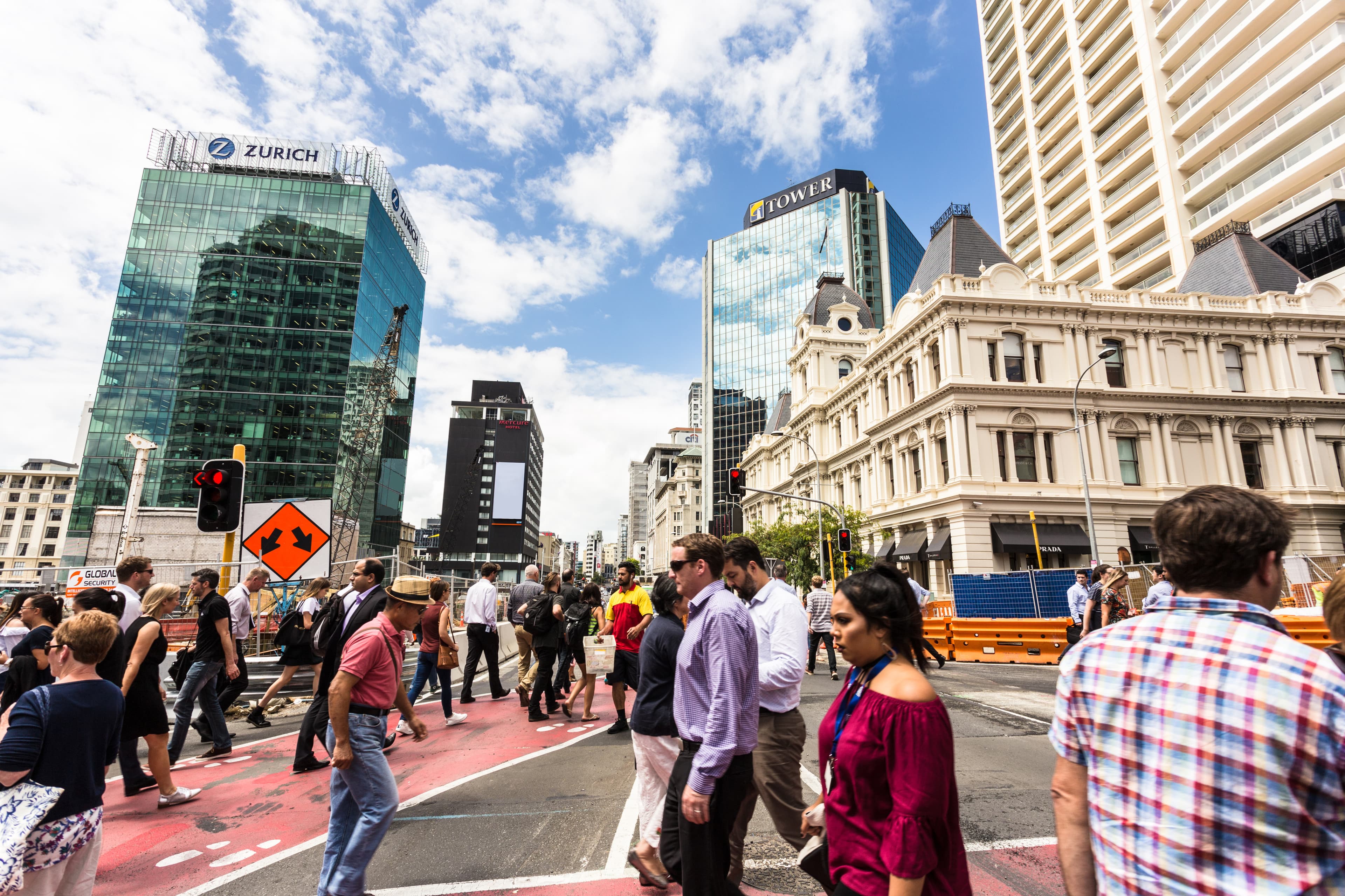 Pedestrians crossing near the construction site of the Auckland City Rail Link.
