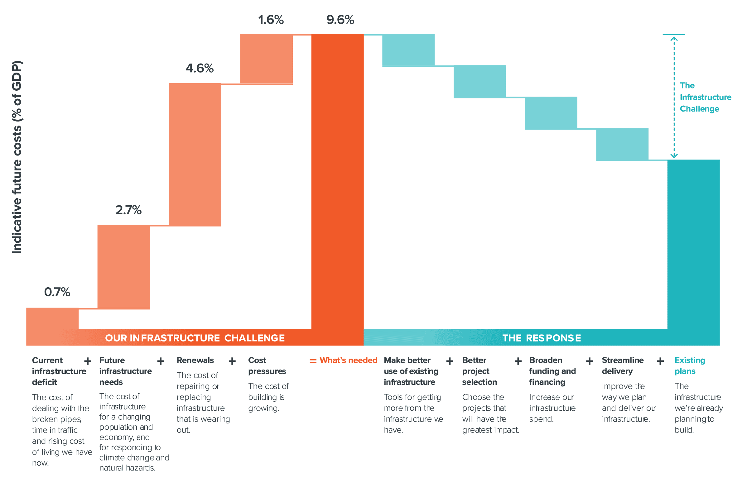 Each response can make a big difference to solving New Zealand’s infrastructure challenge, but the size of the problem is too large for any one action to be enough by itself. We’ll need to use all four to make a difference.