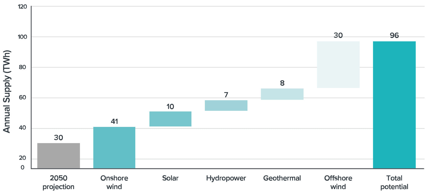 The operation of geothermal generation isn’t carbon-free and gas-fired generation may still be needed to provide electricity when our wind, solar, geothermal and hydro generation can’t meet demand.60 There might also be some industrial processes, like steel and cement production, that require very high temperatures and switching to electricity would be overly costly. In cases like these, we’ll need to explore options for offsetting these, such as by planting more trees and buying emission units from offshore.61
