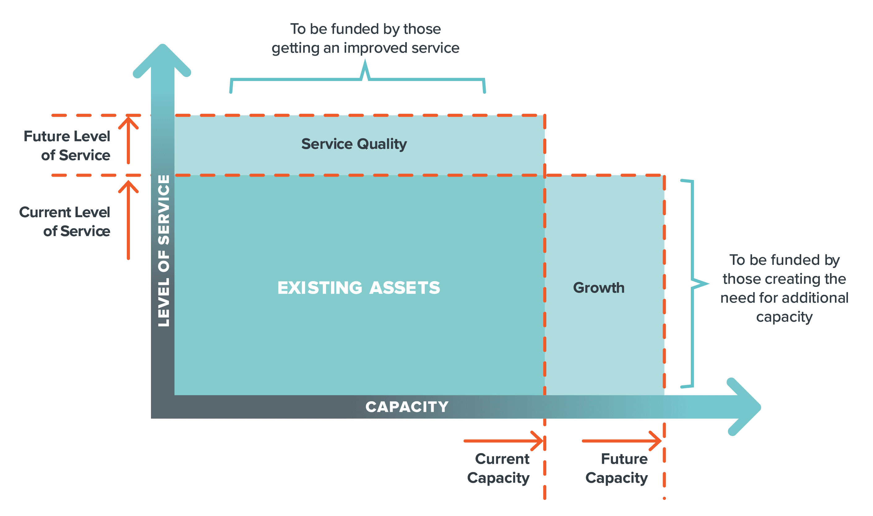 The need for infrastructure upgrades arises in several ways. Increased demand can mean that more services need to be offered (for example, new homes can drive the need for more water connections and roads) or the quality of the service needs to improve (for example, extending the opening hours for a library). Sometimes both an increase and an improvement in services are needed (see Figure 31).354
