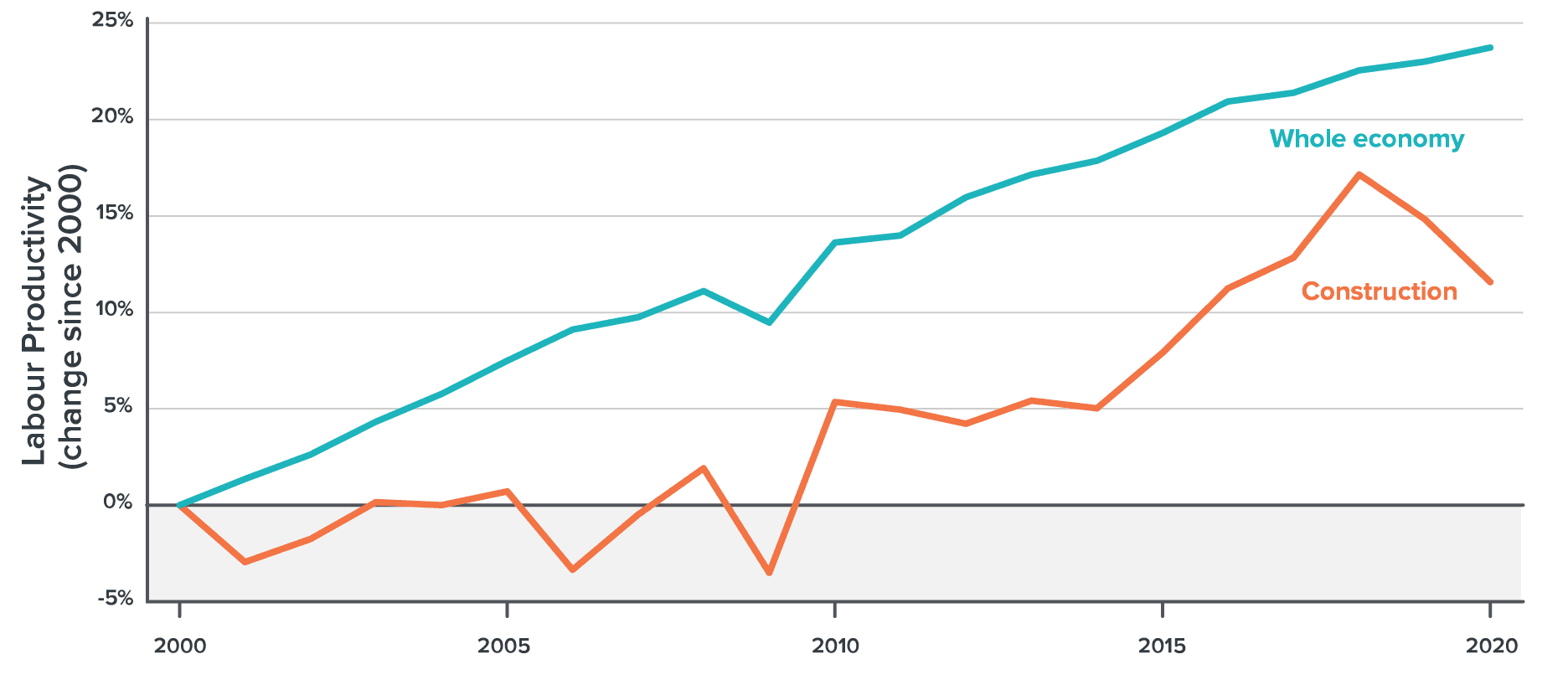 Our workforce challenges hold us back from improving the productivity of our construction sector and limits our ability to build infrastructure at a reasonable cost. Since 2000, the number of people working in heavy and civil construction has more than doubled, but construction labour productivity has lagged behind the overall economy and even declined in both 2019 and 2020 (see Figure 36).