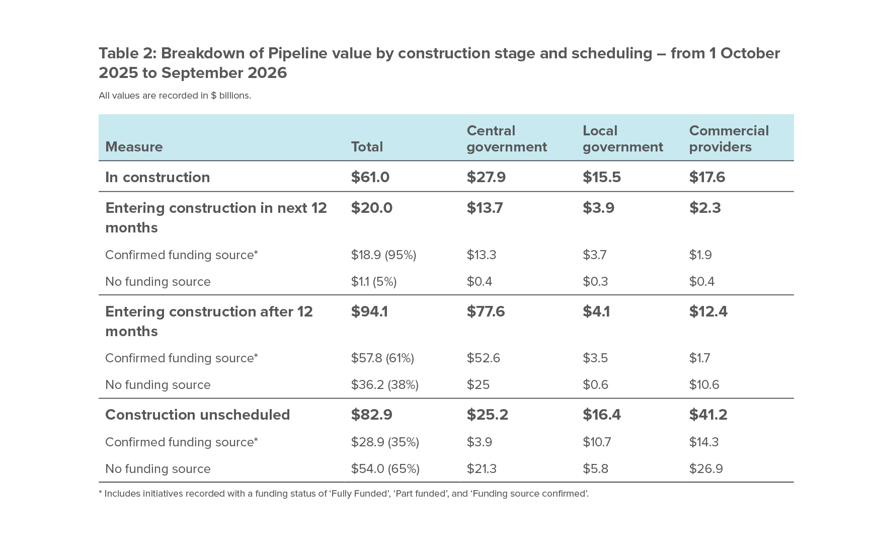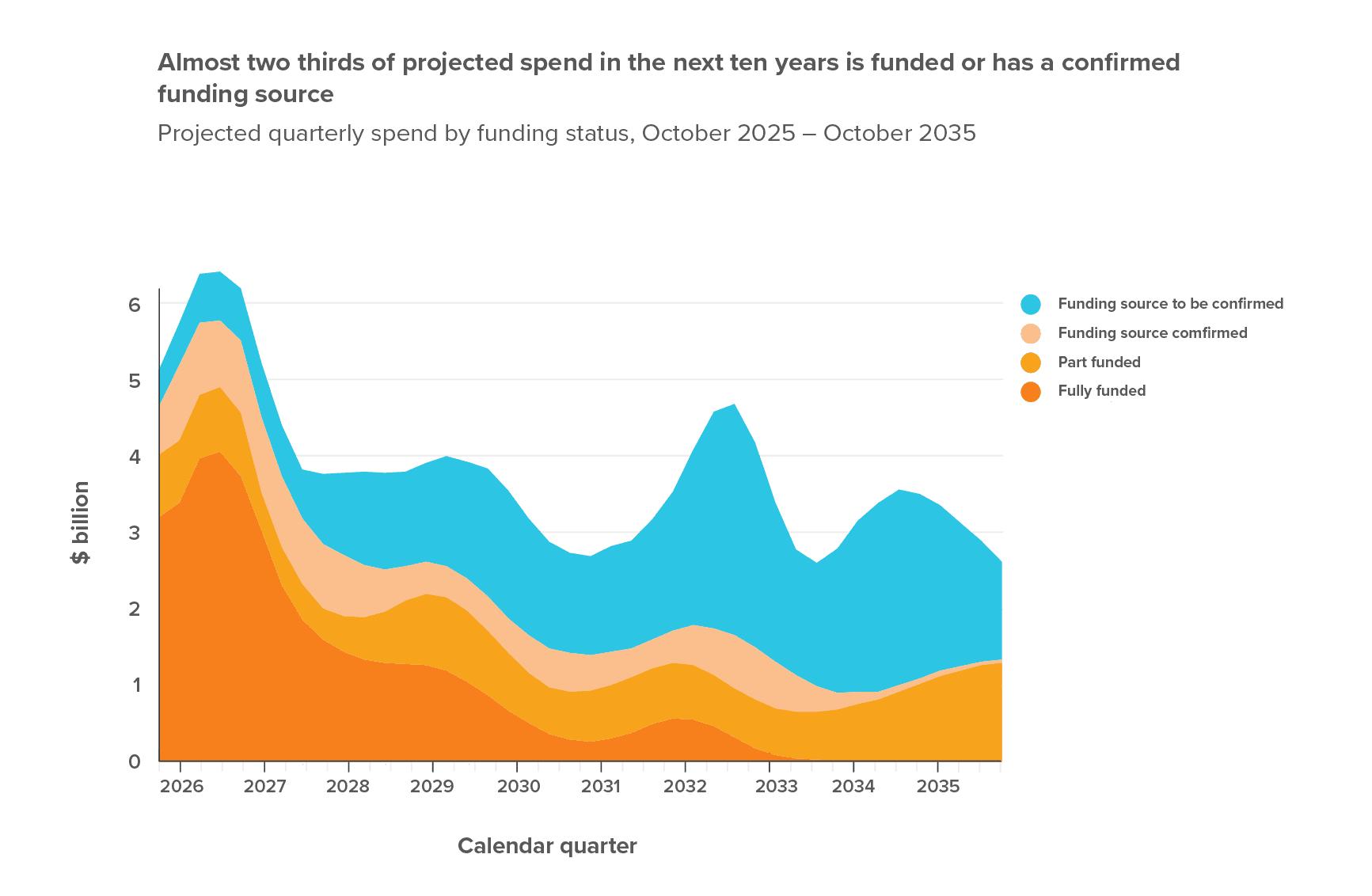 Over 2,500 initiatives with a total expected cost of $61 billion were reported as under construction in September. Our modelling indicates work to progress the delivery of these initiatives will result in $2.7 billion spend from 1 October until the end of 2025, and a further $11.5 billion of spend in 2026 as delivery of the initiatives continues.