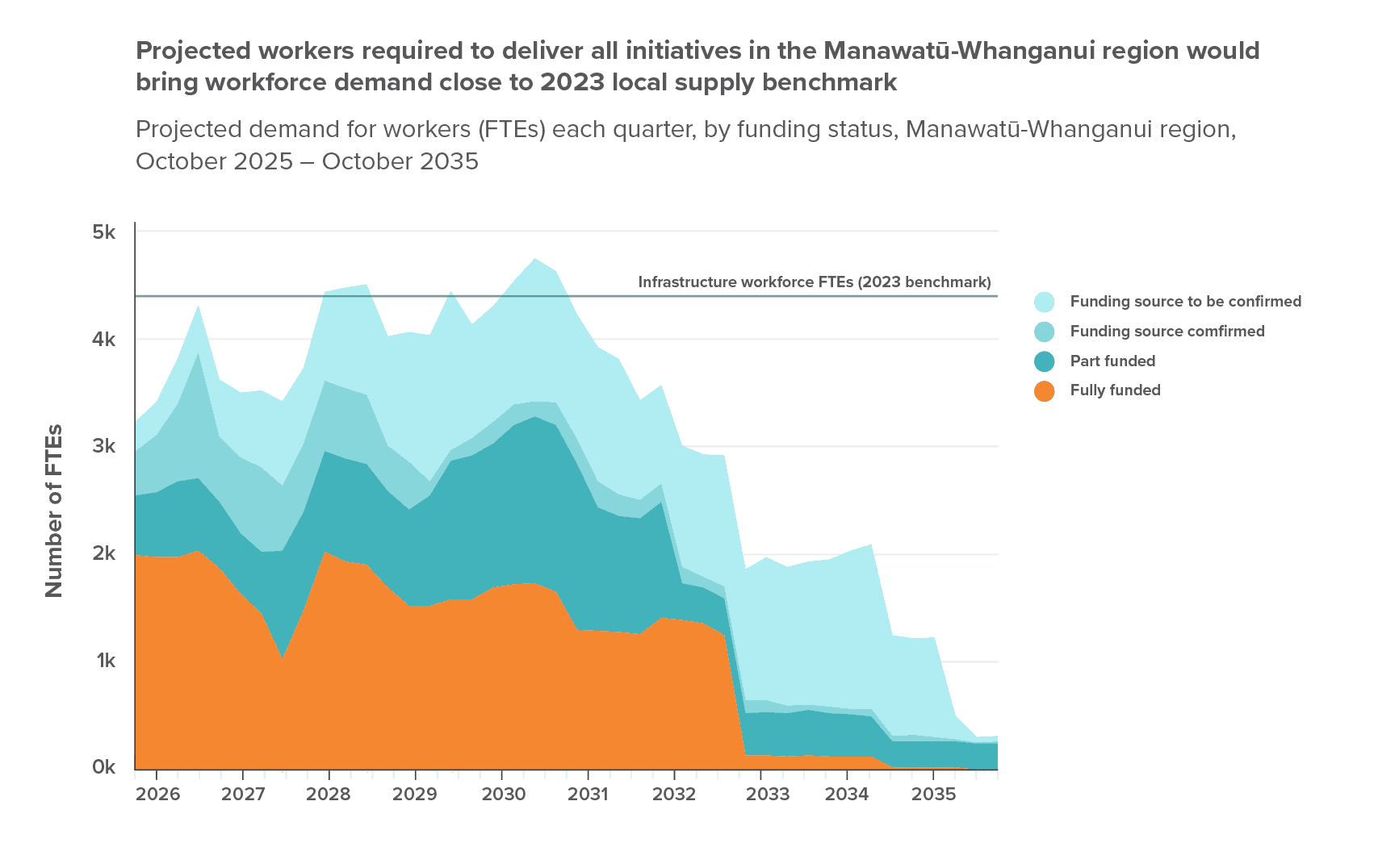 - Figure 7, Manawatū-Whanganui region by initiative funding status (an example) shows stable projected demand close to 2023 local infrastructure workforce supply levels out to 2033. However, about half of the activity is recorded without a funding source confirmed at this time. These initiatives are more likely to change as funding and scheduling decisions are made with impacts on the regional scale of workforce demand and when its needed.