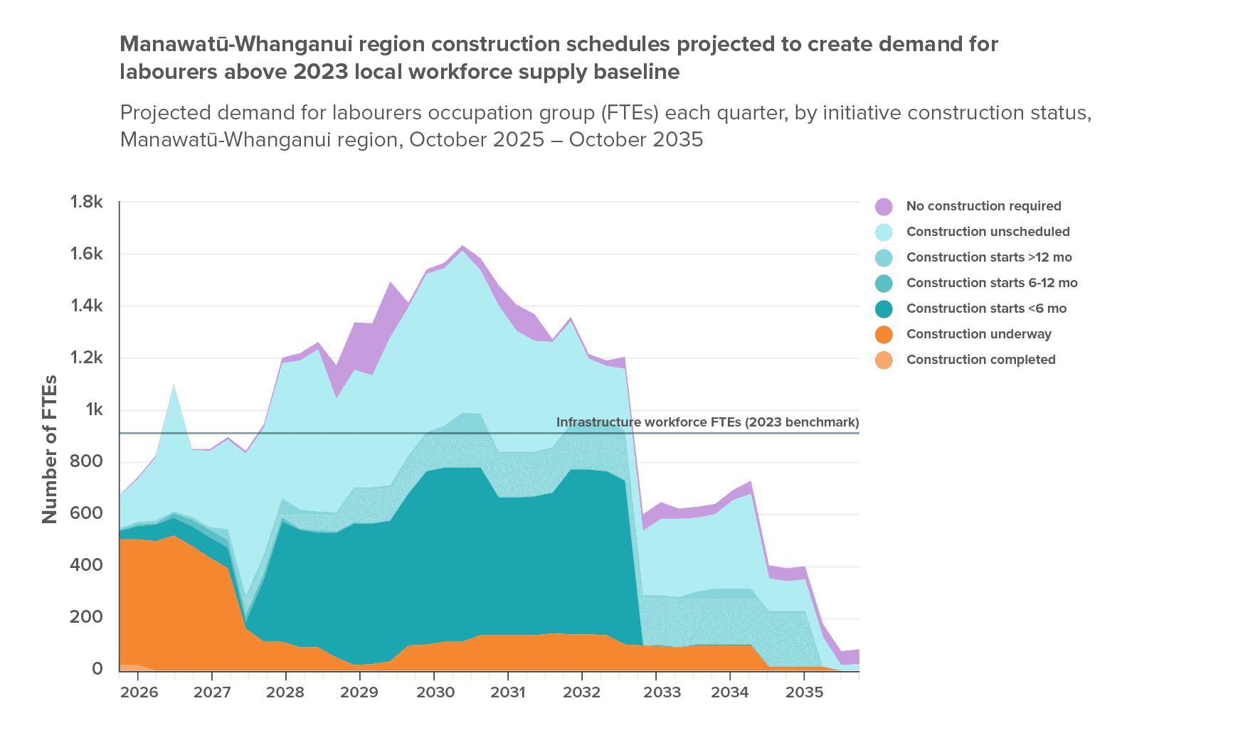 - Figure 8, Manawatū-Whanganui region labourers occupation group by initiative construction status (an example) suggests the projected demand for the labourers group is already close to the 2023 capacity for the region, and between 2028-2033 the demand for labourers may become more constrained in the local market.