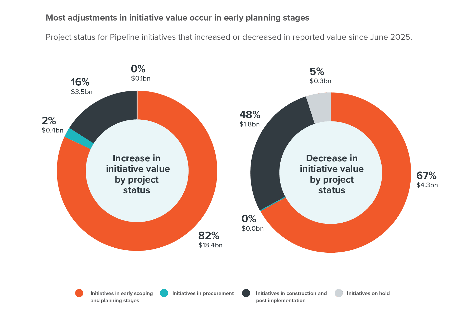 Figure 11 highlights that changes to the expected cost of initiatives are a large driver of change in Pipeline value. Cost estimates for initiatives in early planning stages are typically lower-confidence. However, these early project stages are also the easiest time to accommodate change to these initiatives.