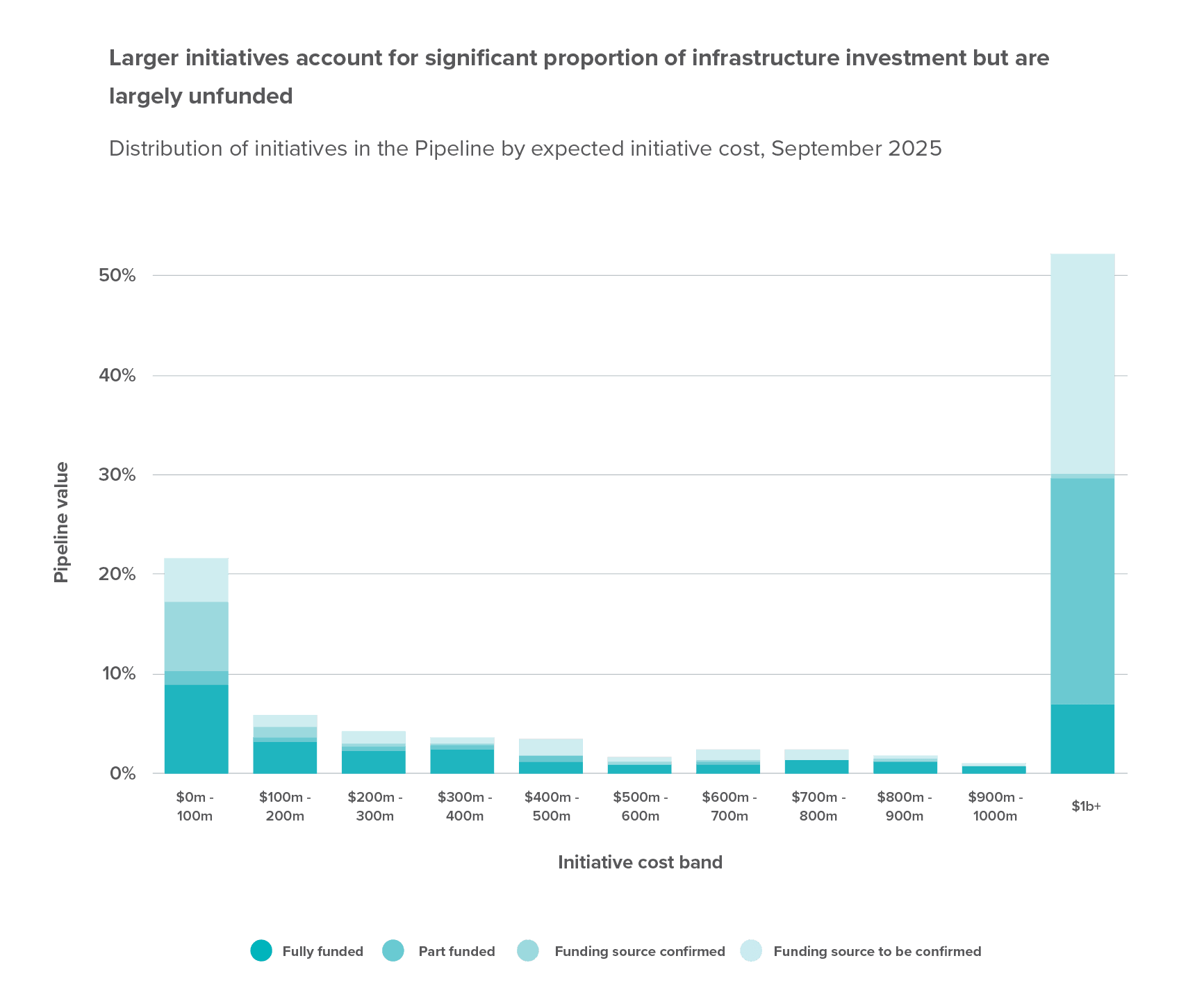 Smaller projects and programmes make an important contribution to achieving stability and confidence in the forward works programme, with 72% of the 11,624 initiatives with expected costs under $100 million reported as having a confirmed funding source (17% of total Pipeline value).