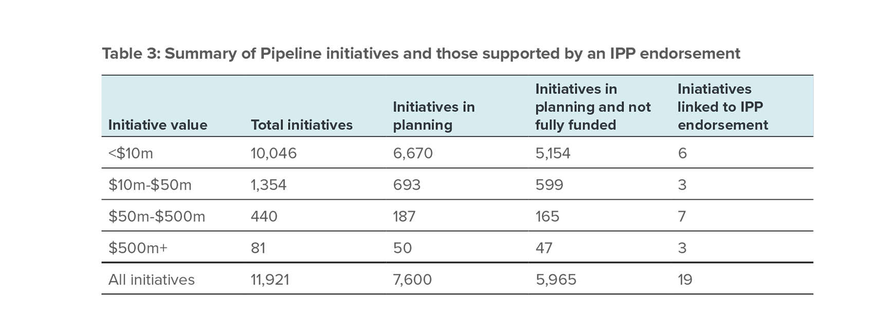 Table 3 highlights there are 19 Pipeline initiatives that are linked to successful proposals endorsed at one of three stages by the Commission’s Infrastructure Priorities Programme (IPP). The IPP undertakes independent standardised assessments of unfunded infrastructure proposals to evaluate strategic alignment, value for money, and deliverability. Results from assessments of applications to round two of the programme are scheduled to be released in December. Any endorsed proposals will be integrated into the Pipeline’s forward view of infrastructure activity and track these as they progress.