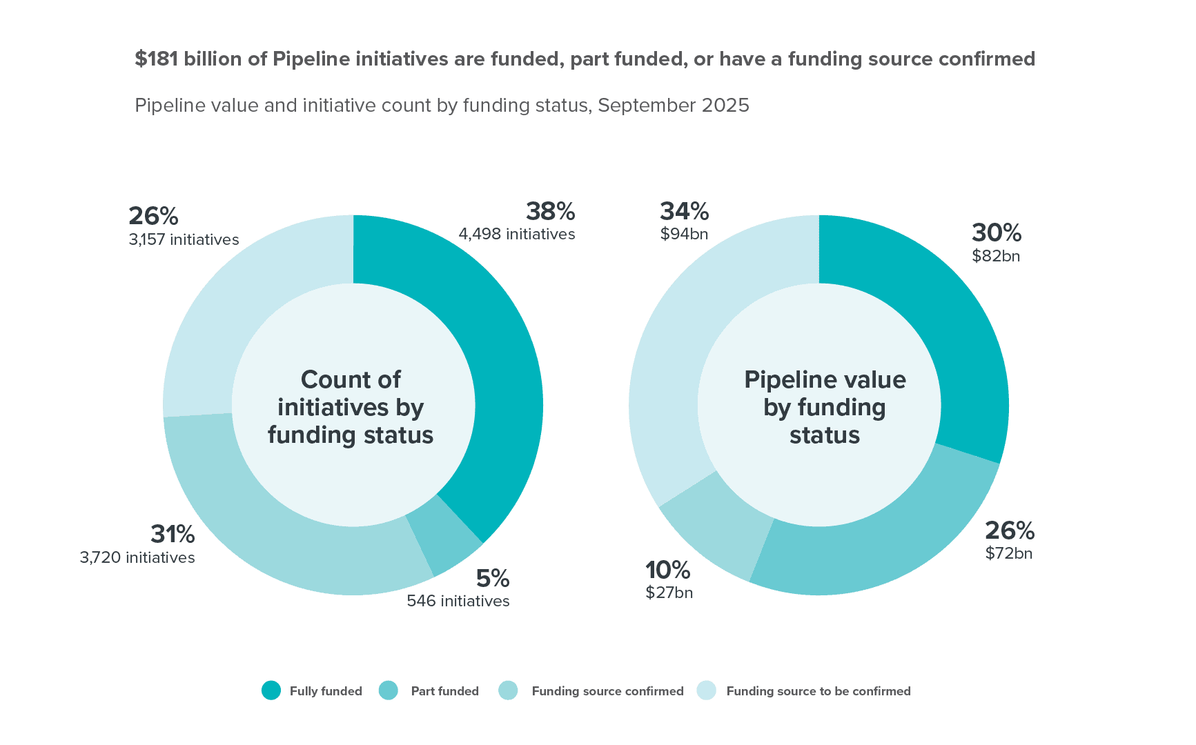 The combined value of initiatives reported as fully funded, part funded or with a confirmed funding source was $181 billion, up $56 billion from June 2025. The drivers of this increase are discussed later the report and shown in Figure 9.
